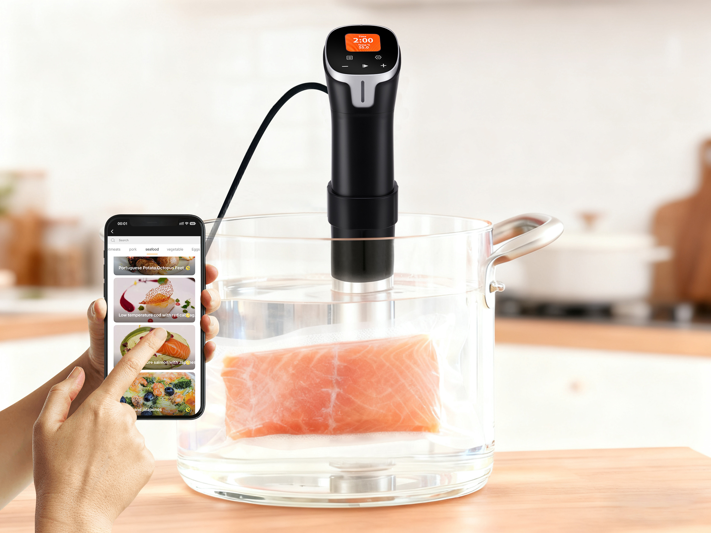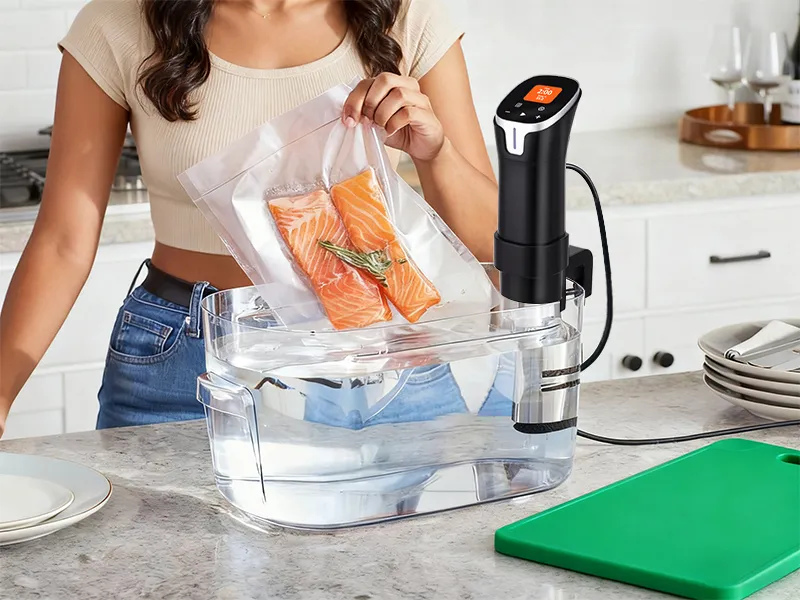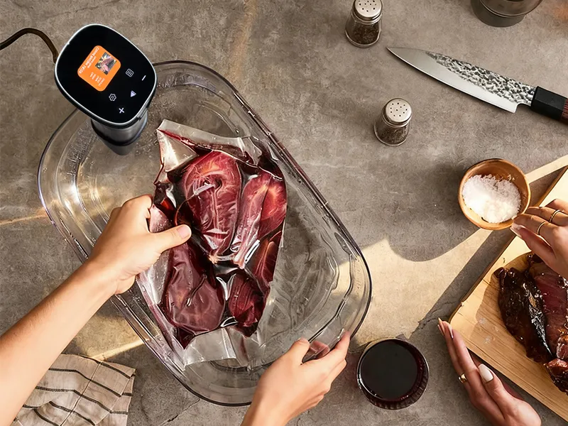 Chaque ingrédient est cuit uniformément du bord au cœur. Pas besoin de s’inquiéter de la surcuisson — notre machine sous-vide utilise un contrôle précis de la température et un bain d’eau circulant pour préserver la consistance parfaite de chaque plat. Même avec une cuisson lente, vous obtenez facilement des résultats idéaux.